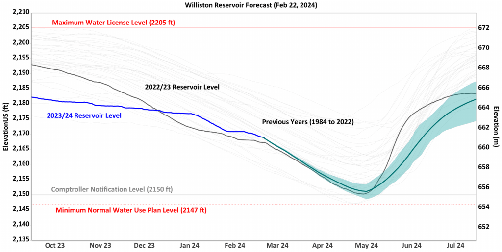 - Minimum spring 2024 Williston Reservoir level is now expected to be between 2147 feet and 2155 feet. This is higher than the forecast provided last month.